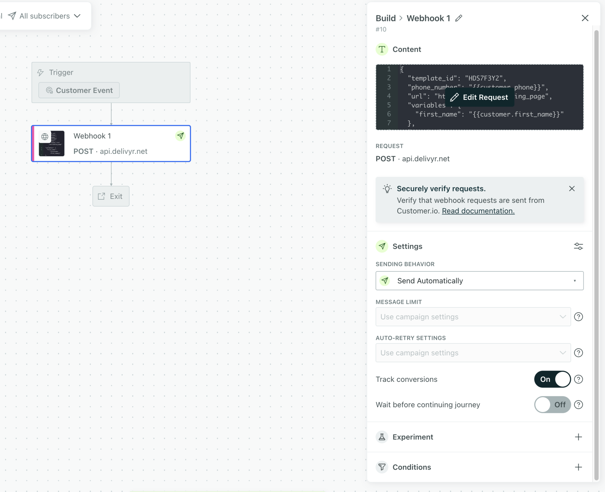 To send a message with Delivyr, create a webhook and enable the “Track conversions” feature.