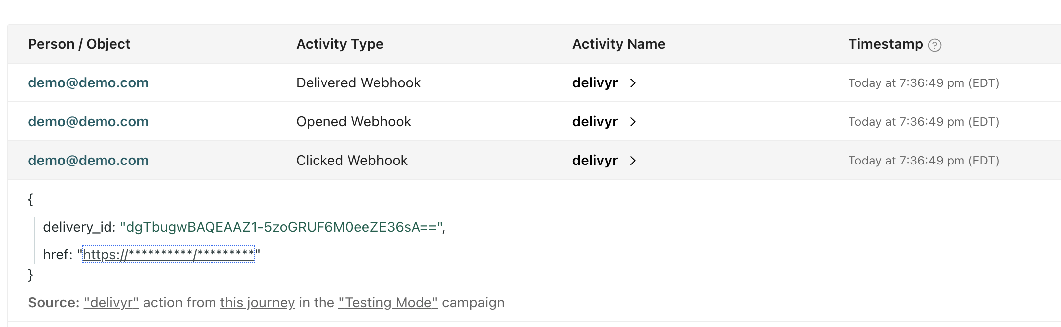 Clicked | When a user clicks on a link. If the user clicks on the link before a delivery receipt is returned, customer.io automatically creates the opened, and delivered events. |