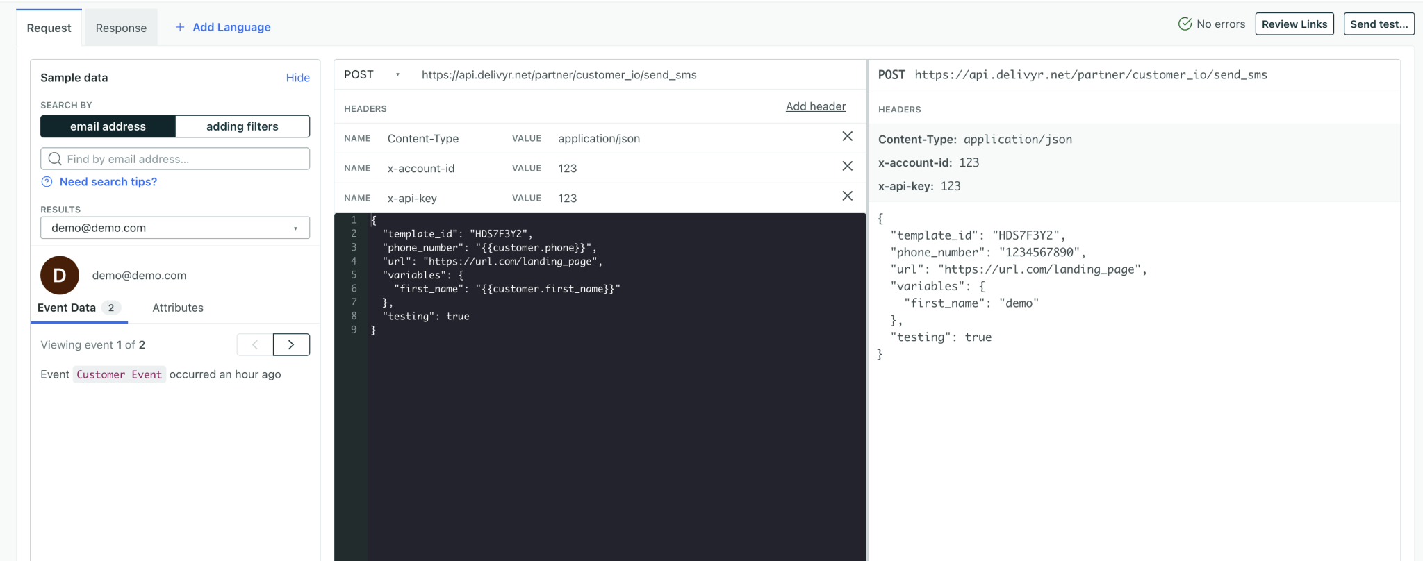 template_id | Login to https://app.delivyr.net and navigate to “Templates” and find a template ID you want to use for this message. The ID is 8 character alpha numeric value. |